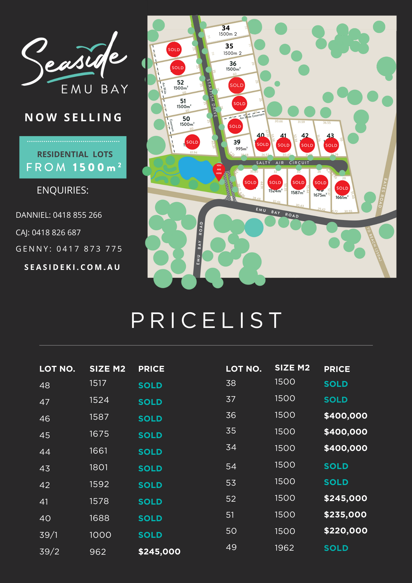 Barely a five minute walk to the beach, Seaside at Emu Bay has an initial Stage One offering of 22 blocks ranging in size from 1500 sqm – 2100 sqm, will pave the way for a complete neighbourhood of generous-sized lots.